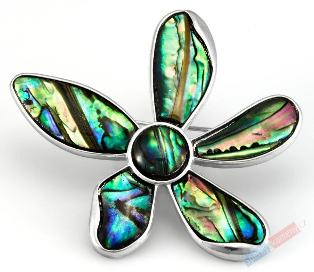 Brož z perleti paua ve tvaru květiny, šířka cca 50 mm, výška cca 45 mm. Zapínání je z kovu stříbrné barvy. Brož je zajímavá i tím, že ji můžete nosit nejen jako brož, ale je na ní také úchyt na řetízek, tzn., že ji můžete nosit jako přívěsek. Perleť může mít malinko jiné odlesky, tím je zaručeno, že budete mít vždy originál.