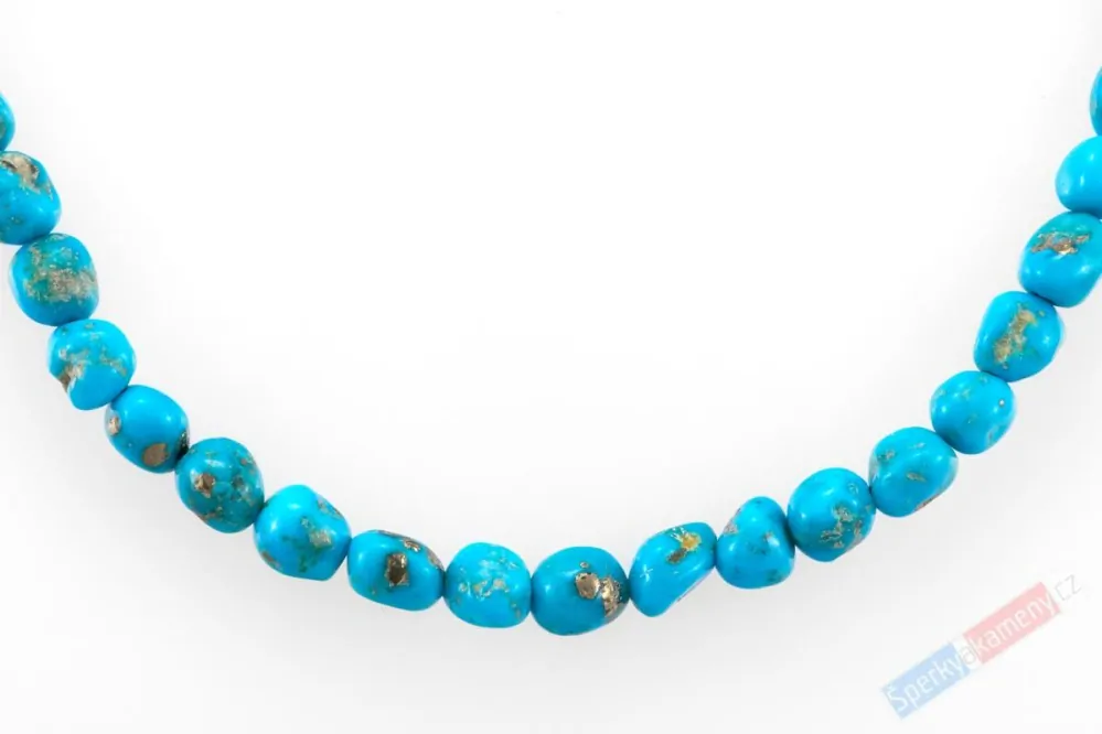 Náhrdelník z arizonského tyrkysu vysoké kvality QA nádherné blankytně modro-tyrkysové barvy s mírnými béžovými prorosty a prorosty pyritu. Náhrdelník je složen z nepravidelných valounků o velikosti cca 4 až 6 mm a stříbrného zapínání s karabinou, protikroužku a ukončovacích kuliček (Ag 925/1000). Délka náhrdelníku je cca 49 cm. Protože se jedná o přírodní materiál, mohou se jednotlivé valounky mírně lišit tvarem a prorosty od fotografie. Původ minerálu: Arizona (USA).