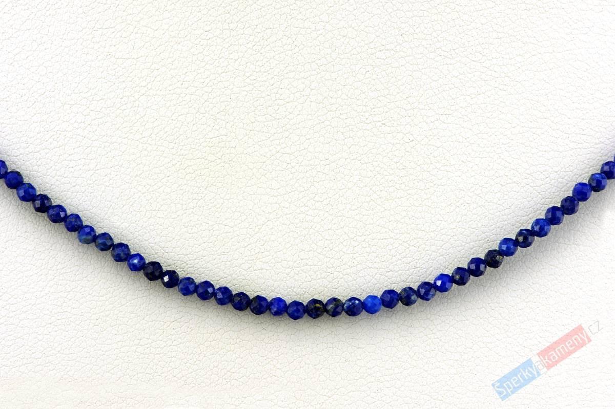 Náhrdelník z broušeného lapisu lazuli vysoké kvality QA a vysokého lesku. Skládá se z fasetovaných, mírně nepravidelných, kuliček o průměru cca 2 mm. Zapínání na karabinu a prodlužovací řetízek zakončený placičkou jsou ze stříbra (vše Ag 925/1000). Délka náhrdelníku je cca 45 cm + 4 cm prodlužovací řetízek. Původ minerálu: Afghánistán.