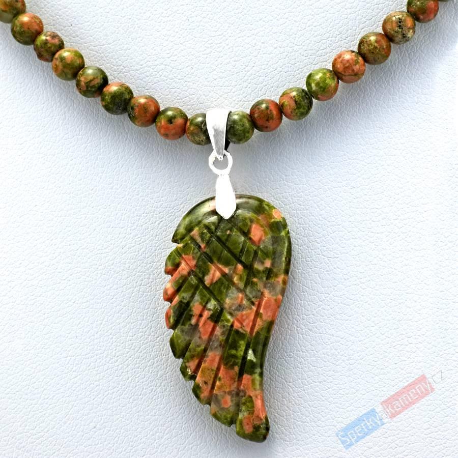 Originální náhrdelník z epidotu/unakitu vysoké kvality QA s přívěškem vysoké kvality QA ve tvaru andělského křídla. Obchodní název unakit je název pro horninu, která obsahuje z většiny zelený epidot, v něž se nachází oranžovorůžové obrazce ze živce. Náhrdelník je složen z korálků o velikosti cca 3 až 4 mm a originálního přívěšku ve tvaru andělského křídla téže barvy o výšce 30 mm (s úchytem cca 40 mm) a šířce cca 16 mm. Úchyt přívěšku, zapínání na karabinu a prodlužovací řetízek zakončený placičkou jsou ze stříbra (Ag 925/1000). Délka náhrdelníku je cca 43 cm + prodlužovací řetízek cca 5 cm. Protože se jedná o přírodní minerál s unikátním probarvením, může se náhrdelník rozložením probarvení mírně lišit od fotografie. Původ minerálu: Norsko.
