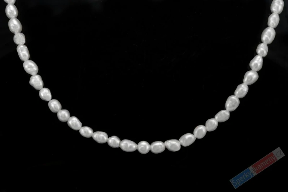 Náhrdelník z bílých říčních perel ve tvaru mírně nepravidelných oválků o velikosti cca 4 mm. Zapínání na karabinu a protikroužek jsou ze stříbra (Ag 925/1000). Délka náhrdelníku je cca 46 cm. Protože se jedná o přírodní materiál, liší se jednotlivé perly mírně tvarem.