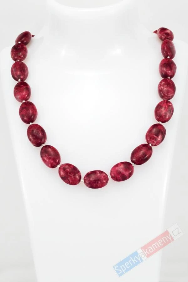 Náhrdelník z thulitu vysoké kvality QA (RARITA). Skládá se z mírně nepravidelných oválků o velikosti cca 15 x 12 mm a stříbrného zapínání na karabinu (Ag 925/1000). Mezi jednotlivé oválky jsou vloženy průhledné mezikuličky o průměru cca 1 mm. Délka náhrdelníku je cca 46 cm. Původ thulitu: Norsko. Náhrdelník je identický s fotografií.