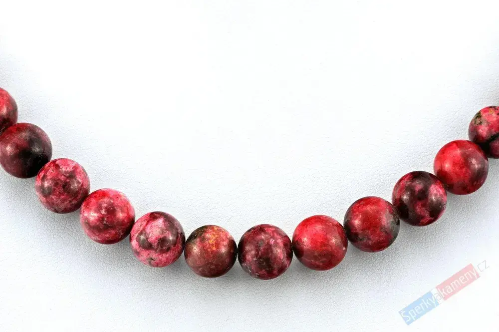 Náhrdelník z thulitu vysoké kvality QA a syté tmavě malinové barvy. Je tvořen kuličkami o průměru cca 8 mm a zapínáním na karabinu a prodlužovacím řetízkem zakončeným placičkou (vše stříbro Ag 925/1000). Délka náhrdelníku je cca 46 cm + 5 cm prodlužovací řetízek. Původ minerálu: Norsko.