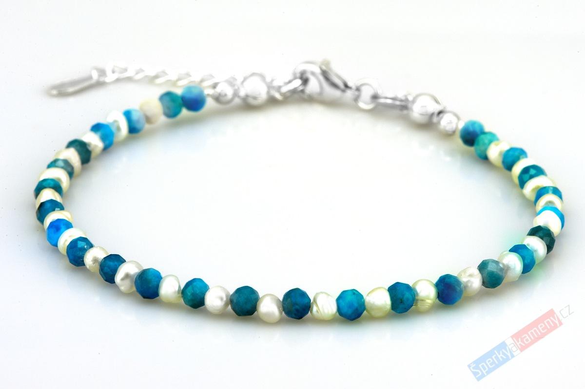 Náramek z arizonského tyrkysu vysoké kvality QA (RARITA) a bílých sladkovodních perel. Náramek je složen z mírně nepravidelných kuliček tyrkysu o velikosti cca 3 mm, perel o velikosti cca 2 až 3 mm, stříbrného zapínání s karabinou, ukončovacích kuliček a stříbrného prodlužovacího řetízku ukončeného placičkou (vše Ag 925/1000). Délka náramku je cca 19,5 cm + prodlužovací řetízek 2,5 cm. Původ minerálu: Arizona (USA).