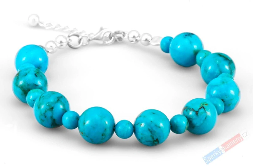 Náramek z arizonského tyrkysu vysoké kvality QA nádherné modro-tyrkysové barvy (RARITA). Náramek je složen z kuliček o průměru cca 10 mm a 5 mm, stříbrného zapínání s karabinou, ukončovacích kuliček, protikroužku a prodlužovacího řetízku ukončeného kuličkou (vše Ag 925/1000). Délka náramku je cca 19 cm + prodlužovací řetízek 2,5 cm. Původ minerálu: Arizona (USA). Náramek je identický s fotografií.