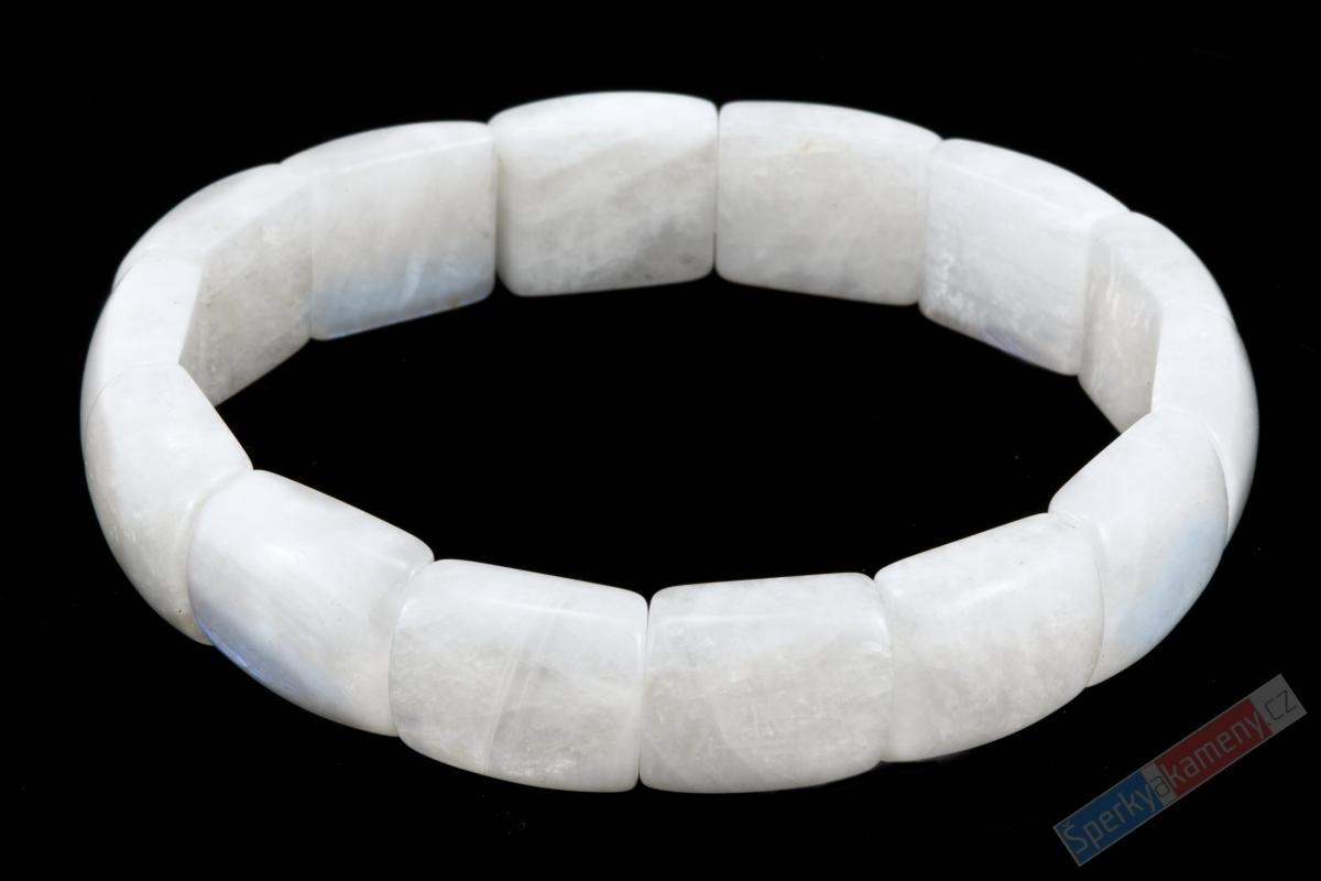 Náramek z bílého měsíčního kamene extra kvality QAA. Plochý, při dopadu světla s nádhernou namodralou opalizací. Náramek se skládá z dílků (z vrchní strany oblých) o velikosti cca 14 x 11 mm, které jsou navlečeny na silikonové gumičky, jenž usnadní nasazení náramku. Původ minerálu: Srí Lanka.