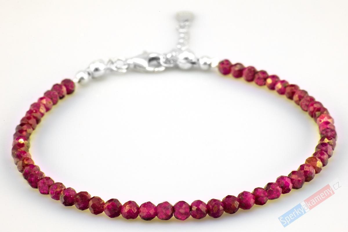 Náramek z broušeného rubínu vysoké kvality QA a lesku, barvy holubí krve s nádechem do fialova. Náramek je složen z fasetovaných, mírně nepravidelných, kuliček o velikosti cca 4 mm, stříbrného zapínání s karabinou, ukončovacích kuliček a stříbrného prodlužovacího řetízku ukončeného kuličkou (vše Ag 925/1000). Délka náramku je cca 19,5 cm + prodlužovací řetízek 2,5 cm. Kuličky nejsou zcela pravidelné, mírná nepravidelnost je díky ruční práci. Původ minerálu: Barma.
