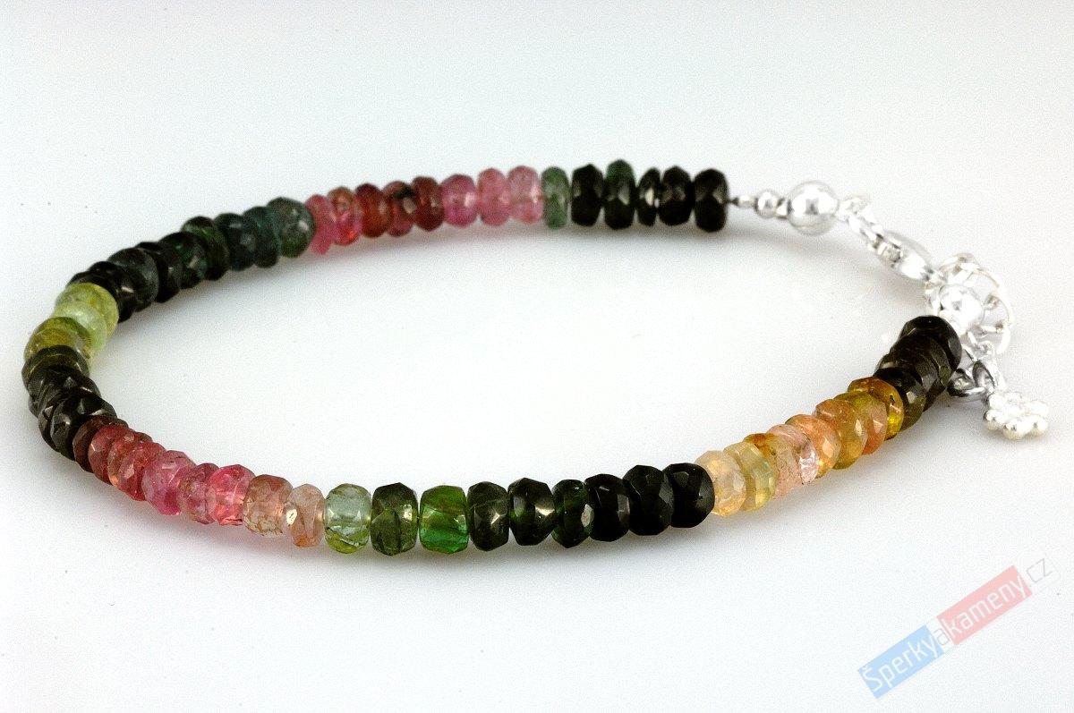 Náramek z broušeného turmalínu vysoké kvality QA a výrazného lesku. Je složený z různých druhů turmalínu výrazných barev. Je tvořen fasetovanými, mírně nepravidelnými čočkami cca 2-3 x 3-4 mm a stříbrného zapínání s karabinou, protikroužku,ukončovacích kuliček a prodlužovacího řetízku ukončeného kuličkou (vše stříbro Ag 925/1000). Délka náramku je cca 19,5 cm + prodlužovací řetízek 2,5 cm. Rozložení barev na náramku nemusí být přesně totožné s fotografií. Barvy náramku jsou vždy poskládané tak, aby byl náramek esteticky zajímavý, tím je zaručeno, že budete mít vždy originál. Původ minerálu – Brazílie.