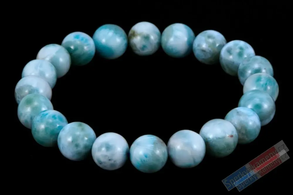 Náramek z larimaru vysoké kvality QA s krásným probarvením a kresbou tohoto vzácného a velmi žádaného minerálu (RARITA). Náramek je složen z kuliček larimaru (20 ks) o průměru cca 10 mm. Navlečen je na silikonovou gumičku, velikost tedy vyhovuje převážně všem typům zápěstí. Původ minerálu: Dominikánská republika, jediné naleziště na světě. Náramek je identický s fotografií.