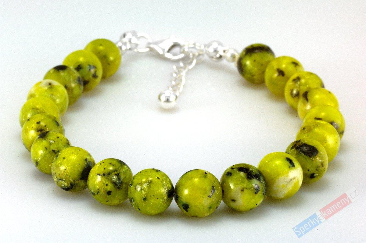 Náramek z lizarditu vysoké kvality QA (RARITA) nazývaného také „norský nefrit“ či „ještěrčí kámen“. Díky své nádherné zelenožluté zářivé barvě je naprosto nepřehlédnutelný. Náramek se skládá z kuliček o velikosti cca 8 mm. Zapínání formou karabiny a prodlužovací řetízek jsou ze stříbra (Ag 925/1000). Délka náramku je cca 19 cm + prodlužovací řetízek cca 2,5 cm zakončený stříbrnou kuličkou. Vzhledem k tomu, že se jedná o přírodní minerál, mohou se jednotlivé korálky mírně lišit tmavými prorosty a probarvením od fotografie. Jeho nepřehlédnutelná zářivá zelenožlutá barva je typická pro jediné naleziště – Norsko.