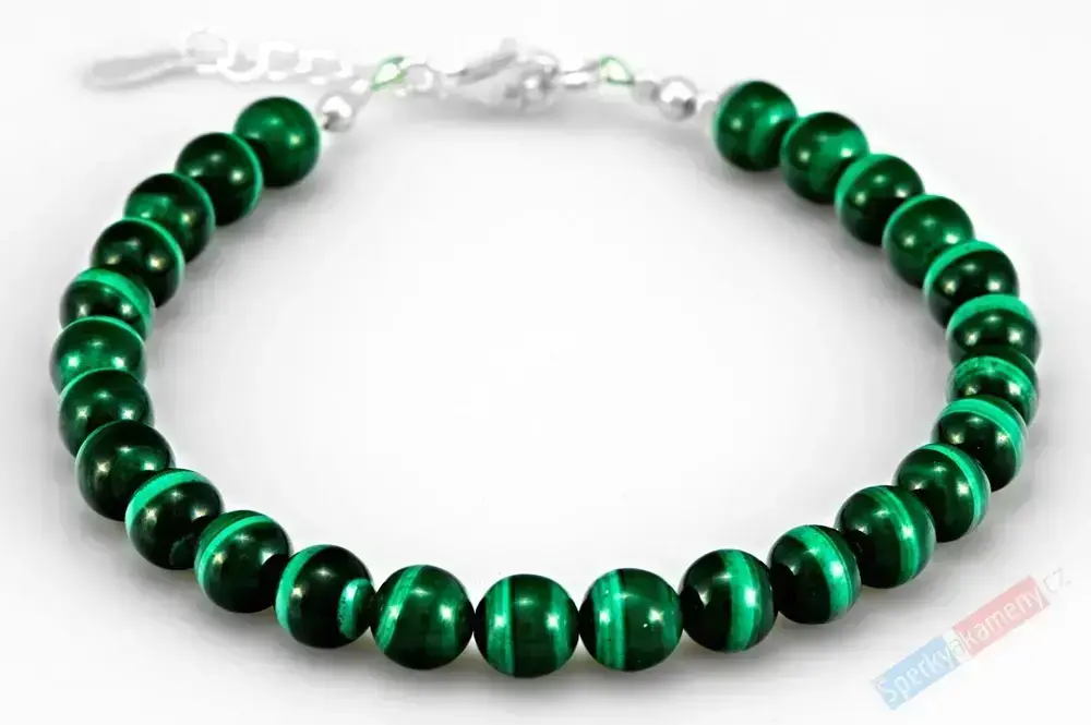 Náramek z pravého malachitu vysoké kvality QA s krásnou kresbou minerálu. Náramek je složen z kuliček o průměru cca 6 mm. Zapínání na karabinu, ukončovací kuličky, protikroužek a prodlužovací řetízek zakončený placičkou jsou ze stříbra (Ag 925/1000). Délka náramku je cca 19 cm + cca 2,5 cm prodlužovací řetízek. Malachit je výjimečný svojí neopakovatelnou kresbou, kresba kuliček se tedy může mírně lišit od fotografie. Původ minerálu: Rusko.