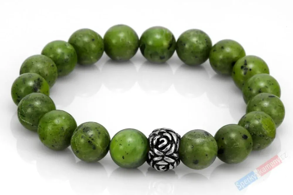 Náramek z pravého nefritu vysoké kvality QA. Je složen z dvacetidvou kuliček o průměru cca 8 mm a ocelového symbolu rozkvetlé růže o velikosti cca 10 mm. Náramek je navlečen na silikonovou gumičku, velikost tedy vyhovuje převážně všem typům zápěstí. Původ nefritu: Barma.
