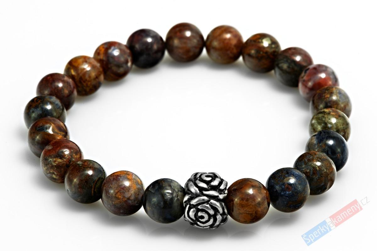 Náramek z pietersitu (RARITA). Je složen z dvacetijedné kuliček o průměru cca 8-8,5 mm a ocelového symbolu rozkvetlé růže o velikosti cca 10 mm. Je navlečen na silikonovou gumičku, velikost tedy vyhovuje převážně všem typům zápěstí. Vzhledem k tomu, že se jedná o minerál s neopakovatelným zabarvením a prokreslením jednotlivých kuliček, může se náramek tímto mírně lišit od fotografie; to vám však zaručuje, že budete mít vždy naprostý originál. Původ minerálu: Outjo, Namíbie.
