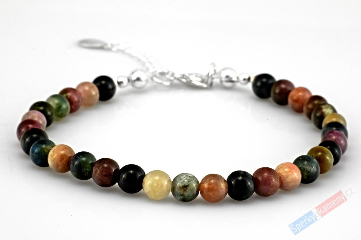 Náramek z různých druhů turmalínu, kuličky cca 4 mm, stříbro Ag 925/1000 "na křídlech andělů III" (TU4361NS)