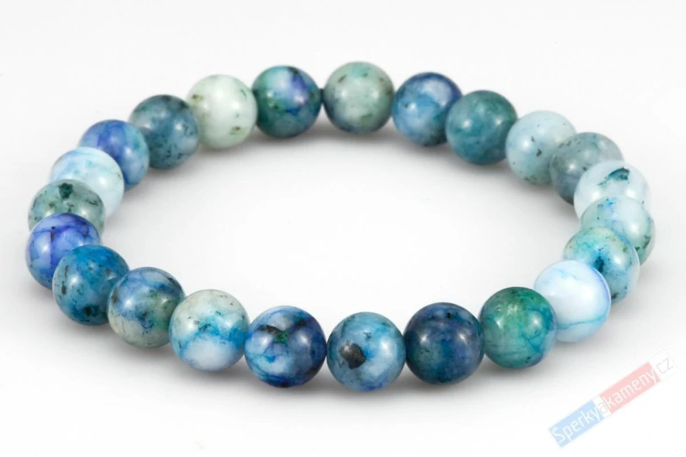 Dámský náramek ze šatukitu se sekundárními minerály azuritem a brochantitem (RARITA). Náramek se skládá z 23 kuliček o průměru cca 9 mm. Náramek je navlečen na silikonovou gumičku, velikost tedy vyhovuje převážně všem typům zápěstí. Vhodný pro zápěstí cca 15 až 19 cm. Protože se jedná o přírodní materiál, liší se jednotlivé korálky probarvením a intenzitou barev, tím se může náramek mírně lišit od fotografie. Díky svému probarvení, které nikdy není totožné, máte vždy jistotu originality a neopakovatelnosti. Původ sloučených minerálů: Namíbie, Kongo.