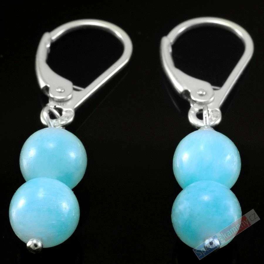 Náušnice z velmi vzácného minerálu hemimorfitu extra kvality QAA (RARITA) nebesky něžné modré barvy připomínající barvu larimaru, avšak jde o čistší až skoro průsvitný minerál. Náušnice jsou složené ze dvou kuliček nad sebou (každá kulička je o velikosti cca 6 mm, celkem se závěsem cca 34 mm). Závěs a zapínání jsou ze stříbra (vše Ag 925/1000). Původ minerálu – Mexiko.