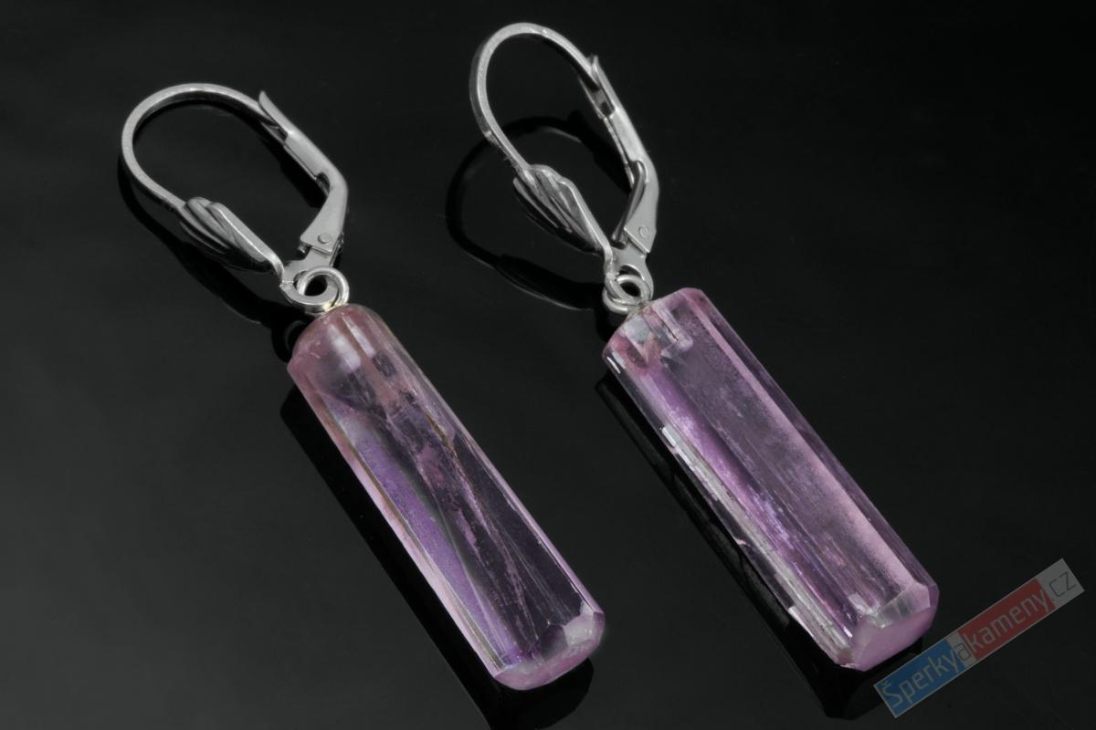 Závěsné naušnice z kunzitu extra kvality QAA (RARITA). Nádherná barva a vysoká průhlednost. Výška náušnice cca 26 mm (se závěsem cca 44 mm) a šířka cca 6 mm; váha obou náušnic je 6,4 g. Úchyt a závěs jsou ze stříbra (Ag 925/1000). Původ minerálu: Brazílie. Náušnice jsou identické s fotografií.