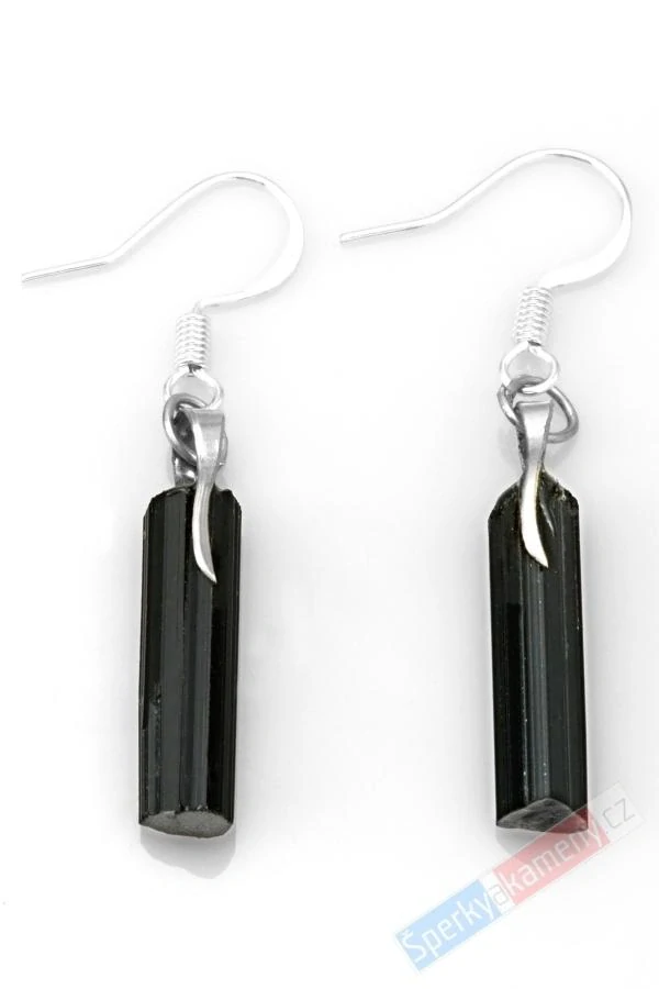 Závěsné náušnice z krystalů turmalínu skorylu. Náušnice o výšce cca 20 mm (se závěsem cca 39 mm) a šířce cca 5 mm. Váha obou náušnic 2,6 g. Úchyt a závěs jsou z bižuterního kovu stříbrné barvy, hypoalergenní. Zarážky jsou silikonové. Náušnice jsou identické s fotografií.