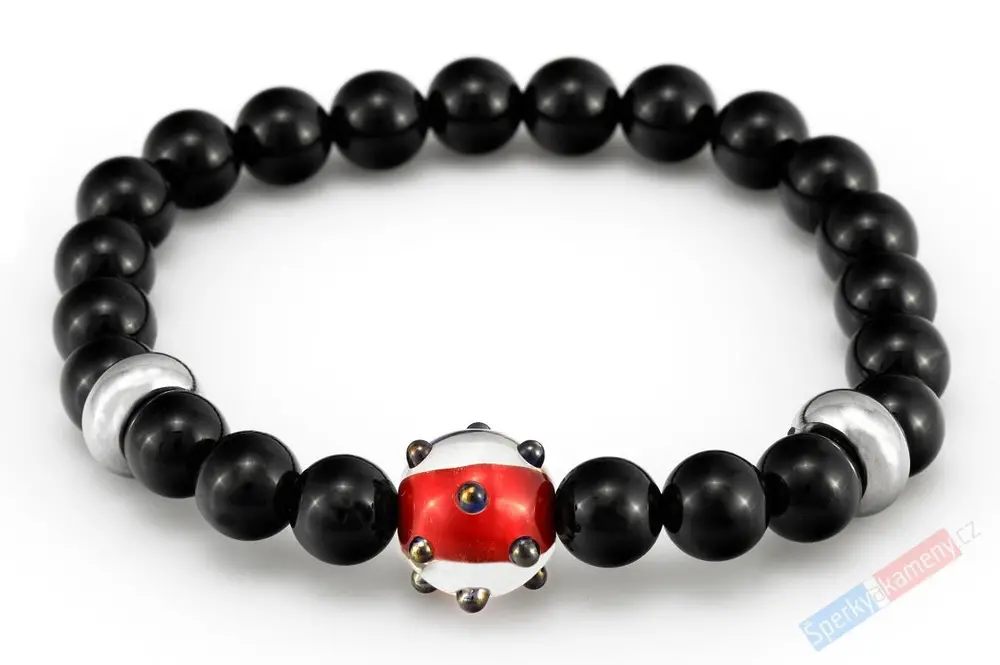 Náramek z onyxu vysoké kvality QA a autorské vinutky s čertími růžky zhotovené šperkařkou Lucií Tunklovou. Náramek je složen z kuliček onyxu o průměru cca 8 mm, jedné červené skleněné „čertí“ vinutky o průměru cca 11 mm a dvou ocelových mezikroužků o velikosti cca 10 x 4 mm. Náramek je navlečen na silikonovou gumičku, velikost tedy vyhovuje převážně všem typům zápěstí.