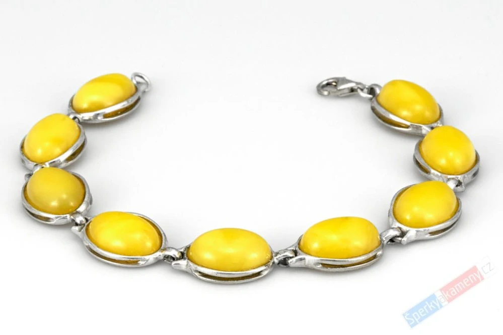 Originální náramek ze žlutého jantaru vysoké kvality QA krásné barvy slunce. Náramek je složen z devíti kamenů ve tvaru oválků zasazených do stříbra o velikosti cca 14 x 12 mm (z toho stříbrné zasazení cca 1 mm), mezikomponentů řetízků, prodlužovacích kroužků a zapínání s karabinou (vše stříbro Ag 925/1000). Délka všech kamenů a mezikomponentů je cca 17 cm; délka celého náramku od karabiny po první zapínací kroužek je cca 19 cm. Váha celého šperku je 15,3 g. Původ minerálu: oblast Baltu, Sambijský poloostrov. Náramek je identický s fotografií.