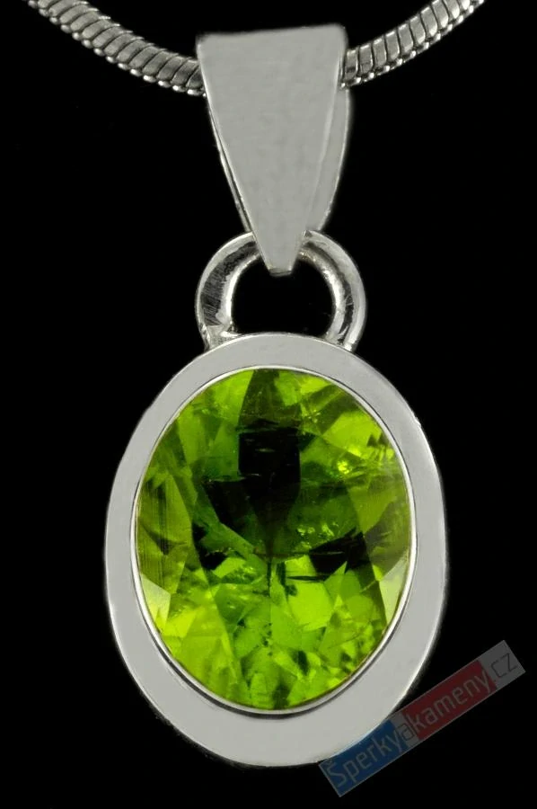 Přívěsek z broušeného olivínu vysoké kvality QA, jarní zelené barvy. Přívěsek ve tvaru oválu o velikosti cca 10 mm (s úchytem cca 18 mm), šířka cca 9 mm; váha 1,7 g. Zasazení, závěs a úchyt jsou ze stříbra (Ag 925/1000). Původ minerálu: Barma. Řetízek není součástí šperku.