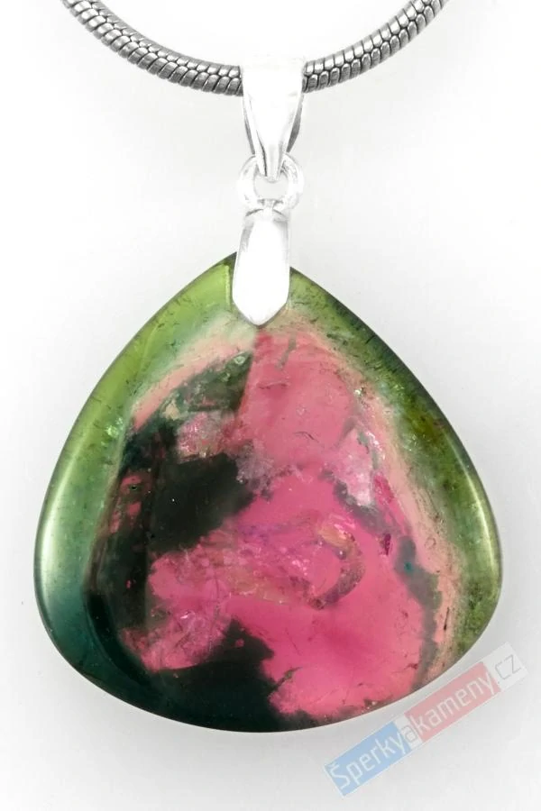 Originální přívěsek z melounového turmalínu extra kvality QAA. Průřez krystalem, kde se nádherně zobrazuje oddělení zelené a růžovo-malinové barvy a vytváří překrásné obrazce. Výška přívěsku cca 20 mm (se závěsem cca 25 mm) a šířka cca 18 mm; váha 3,4 g. Úchyt a závěs jsou ze stříbra (Ag 925/1000). Přívěsek lze nosit oboustranně. Původ minerálu: Brazílie. Přívěsek je identický s fotografií.
