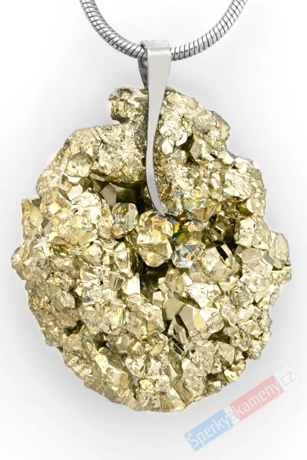 Přívěsek z pyritu vysoké kvality QA. Přívěsek má tvar široké kapky o výšce cca 27 mm (s úchytem cca 32 mm) a šířce cca 24 mm. Úchyt je z kovu stříbrné barvy. Řetízek není součástí šperku. Přívěsek je identický s fotografií.