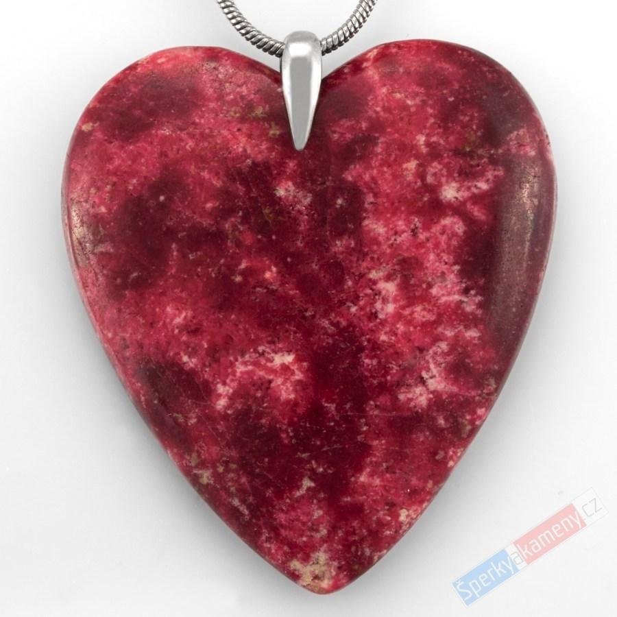 Přívěsek z thulitu extra kvality QAA (RARITA) nádherné, výrazně sytě malinové barvy, která přechází místy až do červena. Přívěsek má tvar srdce o výšce cca 40 mm (s úchytem cca 42 mm) a šířce cca 37 mm; váha 14,9 g. Úchyt je ze stříbra (Ag 925/1000). Země původu: Norsko. Řetízek není součástí šperku. Přívěsek je identický s fotografií.