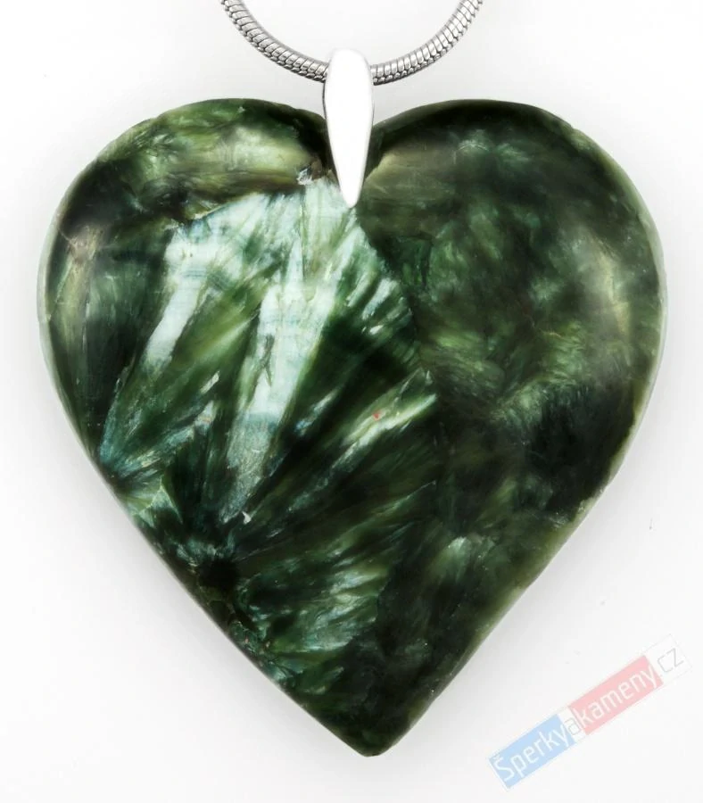 Přívěsek ze serafinitu extra kvality QAA ve tvaru srdce s neopakovatelnou kresbou minerálu (RARITA). Výška přívěsku cca 39 mm (s úchytem cca 41 mm) a šířka cca 37 mm; váha 11,1 g. Úchyt je ze stříbra (Ag 925/1000). Původ minerálu: Sibiř (Rusko). Řetízek není součástí šperku. Přívěsek je identický s fotografií.