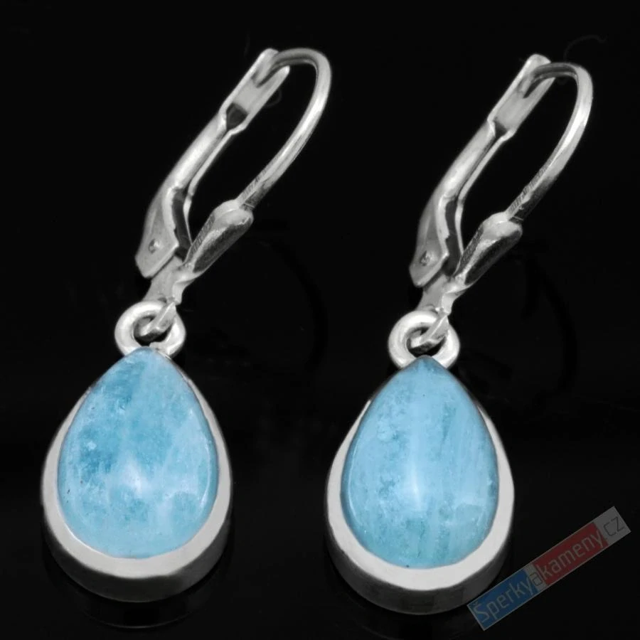 Závěsné náušnice z akvamarínu vysoké kvality QA. Náušnice mají tvar kapek o výšce cca 13 mm (se závěsem cca 32 mm) a šířce cca 9 mm. Váha obou náušnic 4,0 g. Závěs, zasazení a zapínání jsou ze stříbra (Ag 925/1000). Původ minerálu: Brazílie. Náušnice jsou identické s fotografií.
