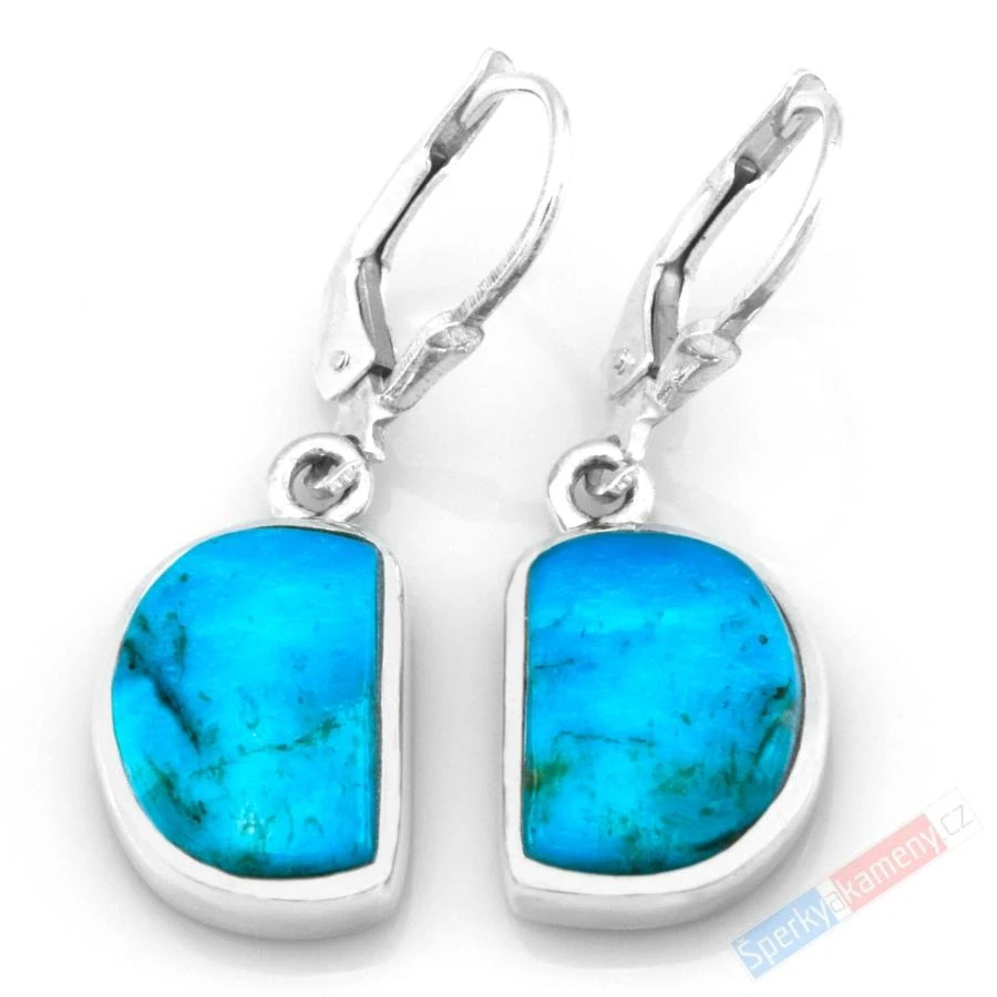 Závěsné náušnice z pravého tyrkysu z Arizony vysoké kvality QA (RARITA) a krásné modro-tyrkysové barvy. Náušnice mají originální tvar o výšce cca 14 mm (se závěsem cca 31 mm) a šířce cca 11 mm; váha obou náušnic 4,4 g. Zasazení, závěs a zapínání jsou ze stříbra (Ag 925/1000). Původ minerálu Arizona (USA). Náušnice jsou identické s fotografií.