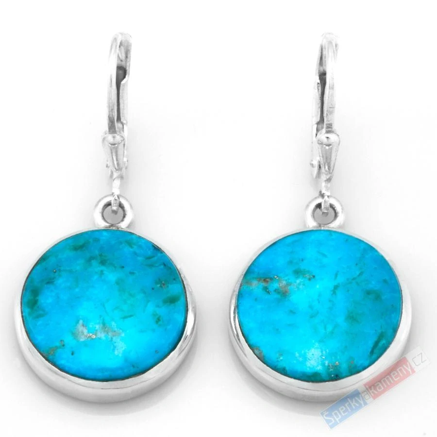 Závěsné náušnice z pravého tyrkysu z Arizony vysoké kvality QA (RARITA) a krásné modro-tyrkysové barvy. Náušnice mají kulatý tvar o průměru cca 16 mm (výška se závěsem cca 32 mm); váha obou náušnic 5,6 g. Zasazení, závěs a zapínání jsou ze stříbra (Ag 925/1000). Původ minerálu Arizona (USA). Náušnice jsou identické s fotografií.