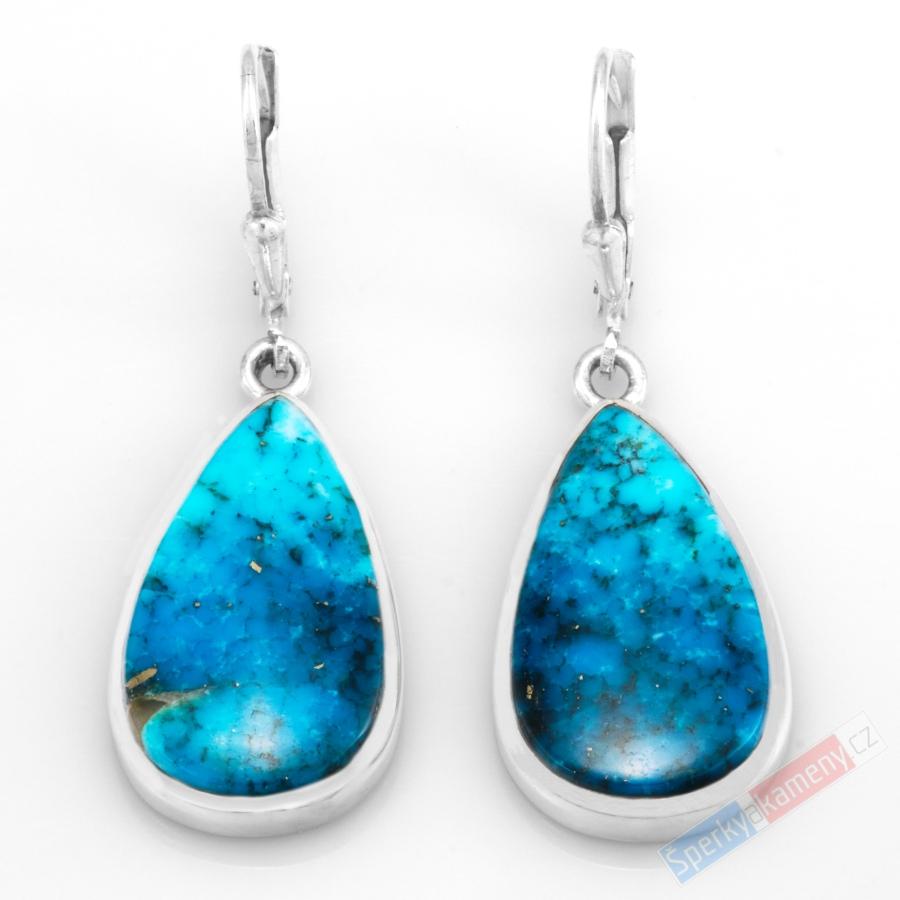 Závěsné náušnice z pravého tyrkysu z Arizony vysoké kvality QA (RARITA) a krásné modro-tyrkysové barvy. Náušnice mají tvar širokých kapek o výšce cca 23 mm (se závěsem cca 40 mm) a šířce cca 14 mm; váha obou náušnic 6,8 g. Úchyt, zasazení, závěs a zapínání jsou ze stříbra (Ag 925/1000). Původ minerálu Arizona (USA). Náušnice jsou identické s fotografií.