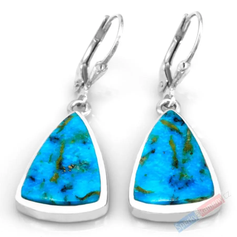 Závěsné náušnice z pravého tyrkysu z Arizony vysoké kvality QA (RARITA) a krásné modro-tyrkysové barvy. Náušnice mají tvar kapek o výšce cca 21 mm (se závěsem cca 37 mm) a šířce cca 14 mm; váha obou náušnic 6,0 g. Úchyt, zasazení, závěs a zapínání jsou ze stříbra (Ag 925/1000). Původ minerálu Arizona (USA). Náušnice jsou identické s fotografií.