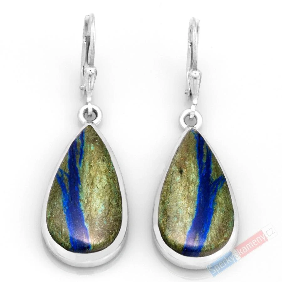 Náušnice z azuritu vysoké kvality QA (RARITA). Nádherné probarvení minerálu připomínající pohled z letadla na tok řeky Kalambo, která vtéká do jezera Tanganika. Náušnice mají tvar kapek o výšce cca 24 mm (se závěsem cca 42 mm) a šířce cca 13 mm; váha obou náušnic 7,8 g. Zasazení, úchyt a závěs jsou ze stříbra (Ag 925/1000). Původ minerálu: Kongo. Náušnice jsou identické s fotografií.