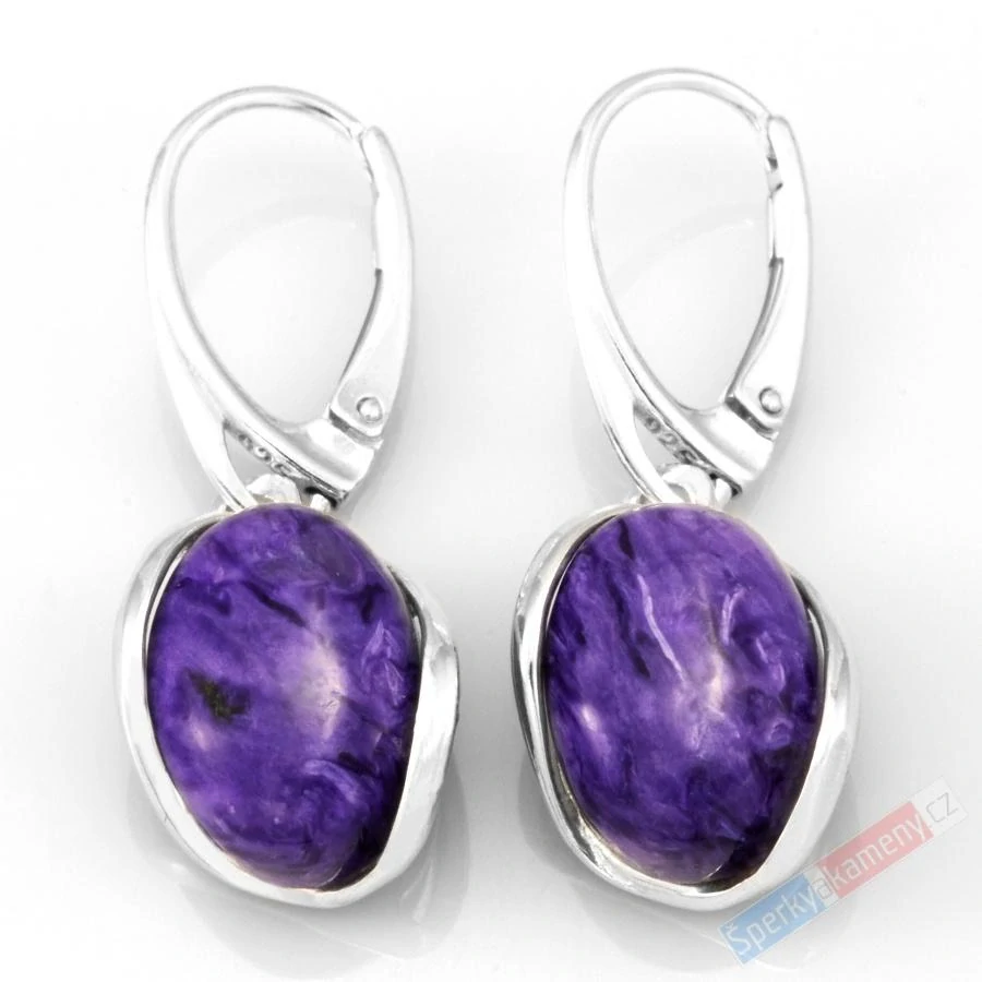 Závěsné stříbrné náušnice s čaroitem extra kvality QAA. Nádherná barva a kresba. Náušnice mají tvar oválků o výšce cca 16 mm (se závěsem cca 33 mm) a šířce cca 12 mm. Váha obou naušnic 6,2 g. Zasazení, úchyt a závěs jsou ze stříbra (Ag 925/1000). Původ čaroitu: Jakutsko (Rusko).