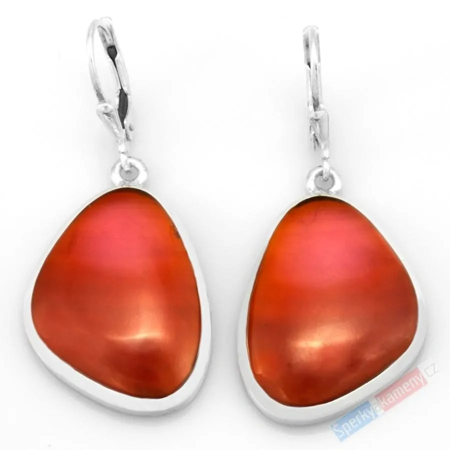 Závěsné náušnice z karneolu vysoké kvality QA. Sytě oranžová barva, jež vyvolává touhu zakousnout se do zralého pomeranče. Náušnice mají tvar nepravidelných kapek o výšce cca 25 mm (se závěsem cca 43 mm) a šířce cca 19 mm; váha obou náušnic 10,2 g. Úchyt, závěs a zasazení jsou ze stříbra (Ag 925/1000). Náušnice jsou identické s fotografií.