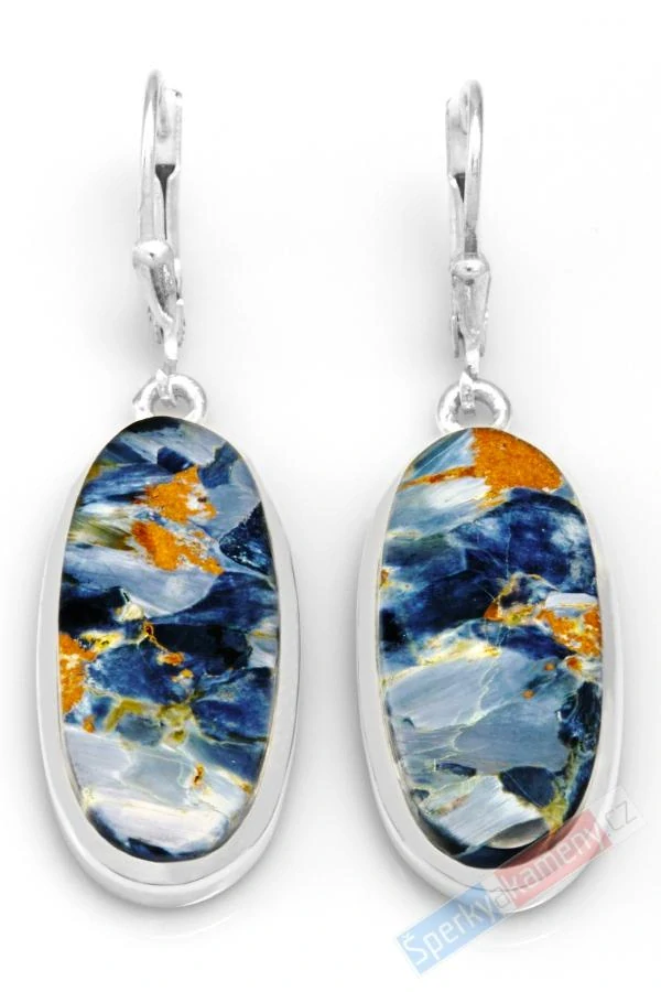 Závěsné náušnice z pietersitu vysoké kvality QA (RARITA) a nádherné opalizace. Náušnice mají tvar oválů o výšce cca 27 mm (se závěsem cca 45 mm) a šířce cca 13 mm; váha obou náušnic 8,8 g. Zasazení, úchyt a závěs jsou ze stříbra (Ag 925/1000). Původ minerálu Outjo, Namíbie. Náušnice jsou identické s fotografií (čelně nasvíceno).