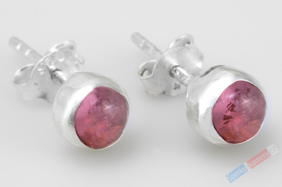 Náušnice z turmalínu rubelitu vysoké kvality QA. Puzetky o průměru cca 6 mm. Váha 1,4 g. Zasazení, úchyt a zarážky jsou ze stříbra (Ag 925/1000).