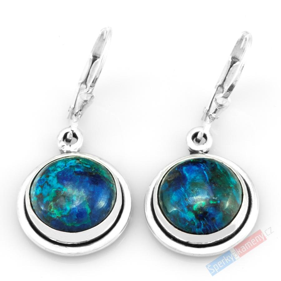 Závěsné náušnice z nádherně zbarveného šatukitu (shattuckit) vysoké kvality QA (RARITA) s výraznou kresbou připomínající podmořský svět v němž převládá tyrkysová barva. Náušnice mají kulatý tvar o průměru cca 15 mm (z toho stříbrná obruba cca 1 mm). Výška se závěsem cca 32 mm; váha obou náušnic 5,8 g. Zasazení, úchyt a závěs jsou ze stříbra (Ag 925/1000). Původ minerálu: Namíbie. Náušnice jsou identické s fotografií.