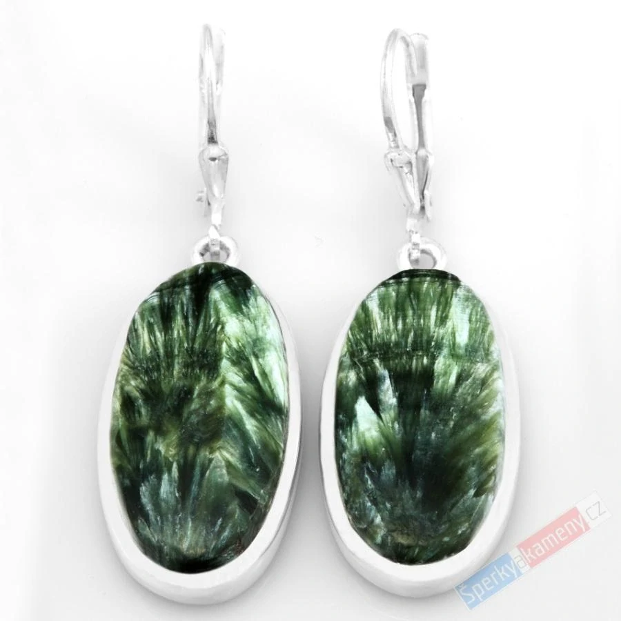 Závěsné náušnice z nádherně zbarveného vzácného serafinitu extra kvality QAA (drahokamová odrůda klinochloru) s neopakovatelnou kresbou minerálu (RARITA). Náušnice mají tvar kapek o výšce cca 27 mm (se závěsem cca 45 mm) a šířce cca 13 mm; váha obou náušnic 8,4 g. Zasazení, závěs a úchyt jsou ze stříbra (Ag 925/1000). Původ minerálu: Sibiř (Rusko). Náušnice jsou identické s fotografií.