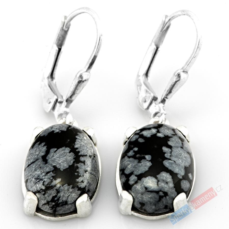 Závěsné náušnice ze sněžného (neboli vločkového) obsidiánu vysoké kvality QA. Náušnice mají tvar oválů o výšce cca 14 mm (s úchytem cca 28 mm) a šířce cca 11 mm; váha obou náušnic 3,6 g. Závěs, zasazení a zapínání jsou ze stříbra (Ag 925/1000). Sněžný obsidián má vždy naprosto originální prokreslení minerálu, naušnice se tedy tímto prokreslením mohou mírně lišit od fotografie. Původ minerálu : Etiopie.