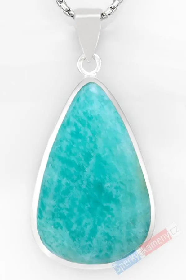 Přívěsek z amazonitu vysoké kvality QA. Nádherná, pohled upoutávající světle-tyrkysová barva. Přívěsek má tvar větší kapky o výšce cca 40 mm (s úchytem cca 49 mm), šířce cca 26 mm a váze 13,4 g. Úchyt, závěs a zasazení jsou ze stříbra (Ag 925/1000). Řetízek není součástí šperku. Původ minerálu: Peru. Přívěsek je identický s fotografií.