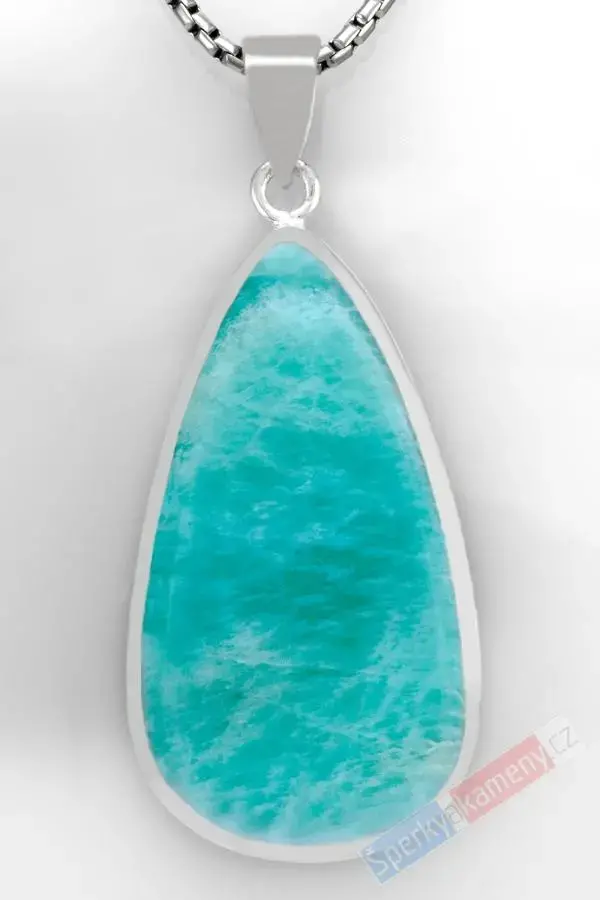 Přívěsek z amazonitu vysoké kvality QA. Nádherná, pohled upoutávající světle-tyrkysová barva. Přívěsek má tvar větší kapky o výšce cca 45 mm (s úchytem cca 58 mm), šířce cca 25 mm a váze 14,3 g. Úchyt, závěs a zasazení jsou ze stříbra (Ag 925/1000). Řetízek není součástí šperku. Původ minerálu: Peru. Přívěsek je identický s fotografií.