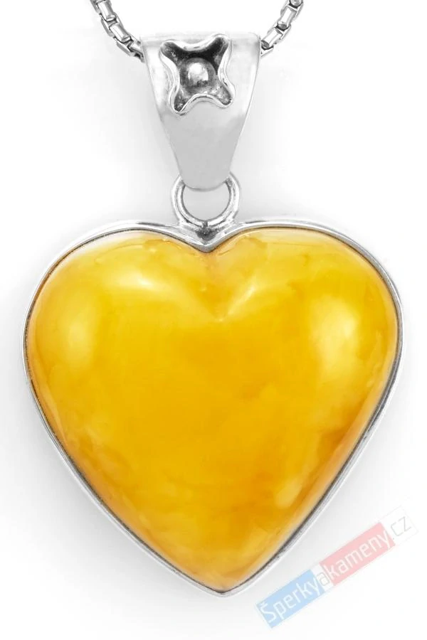 Přívěsek z baltského jantaru extra kvality QAA ve tvaru srdce. Nádherná žlutá barva připomínají letní sluníčko. Tento druh nádherných jantarů se nachází pouze na Baltu. Přívěsek má originální tvar srdce o výšce a šířce cca 35 mm (výška se závěsem cca 51 mm) a tloušťce/hloubce cca 13 mm; váha 20,0 g. Zasazení, úchyt a závěs jsou ze stříbra (Ag 925/1000). Původ minerálu: oblast Baltu, Polsko. Řetízek není součástí šperku. Přívěsek je identický s fotografií.