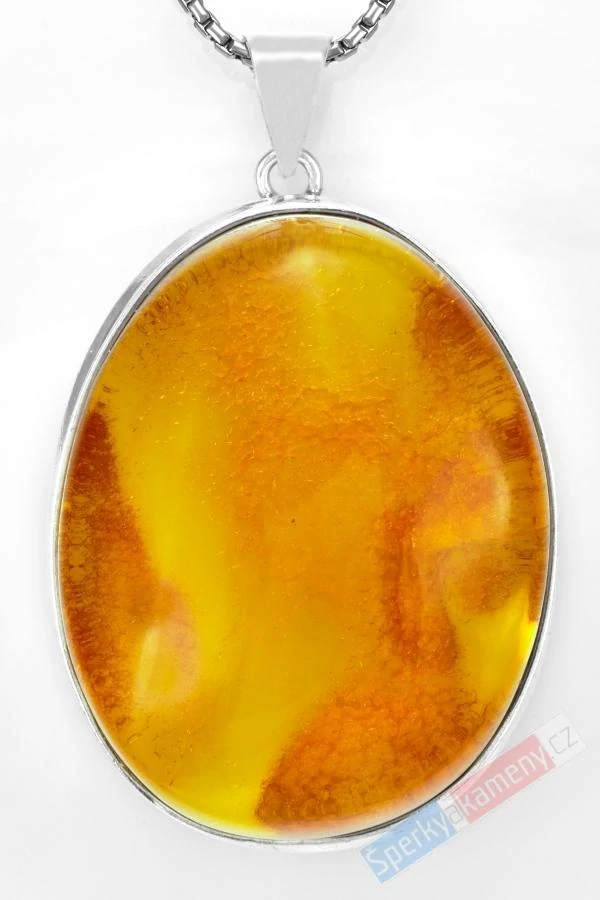 Velký přívěsek z baltského jantaru extra kvality QAA. Nádherná medová barva s prorosty uvnitř přívěsku. Pokud se podíváte proti světlu uvidíte uvnitř přívěsku prorosty, které působí dojmem krajky. Tento typ jantarových přívěsků má větší tloušťku, aby vynikla jejich vnitřní krása. Tento druh nádherných jantarů se nachází pouze na Baltu. Přívěsek má tvar oválu o výšce cca 52 mm (se závěsem cca 67 mm), šířce cca 42 mm a tloušťce/hloubce cca 18 mm; váha 37,3 g. Zasazení, úchyt a závěs jsou ze stříbra (Ag 925/1000). Původ minerálu: oblast Baltu, Polsko. Řetízek není součástí šperku. Přívěsek je identický s fotografií.
