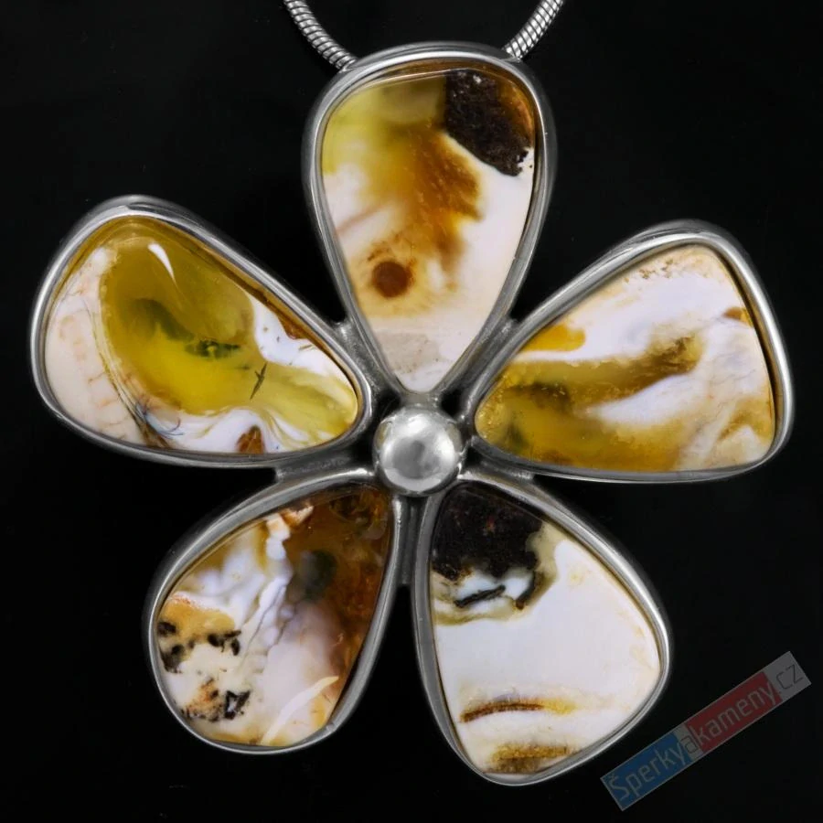 Originální přívěsek z bílého baltského jantaru extra kvality QAA. Nádherné probarvení, jehož základem je bílá barva. Tento typ nádherných jantarů se nachází pouze na Baltu. Přívěsek má tvar květiny s pěti mírně nepravidelnými listy z jantaru zasazenými do stříbra. Střed přívěsku vytváří kulička ze stříbra. Výška a šířka květiny je cca 40 mm. Přívěsek dotváří originální zasazení, kde závěs je skryt na rubové straně tak, aby nerušil kompozici přívěsku. Váha přívěsku je 22,7 g. Úchyt, zasazení, střed přívěsku a částečné zadní strany okvětních lístků jsou ze stříbra (Ag 925/1000). oblast Baltu, Polsko. Přívěsek je identický s fotografií. Řetízek není součástí šperku.