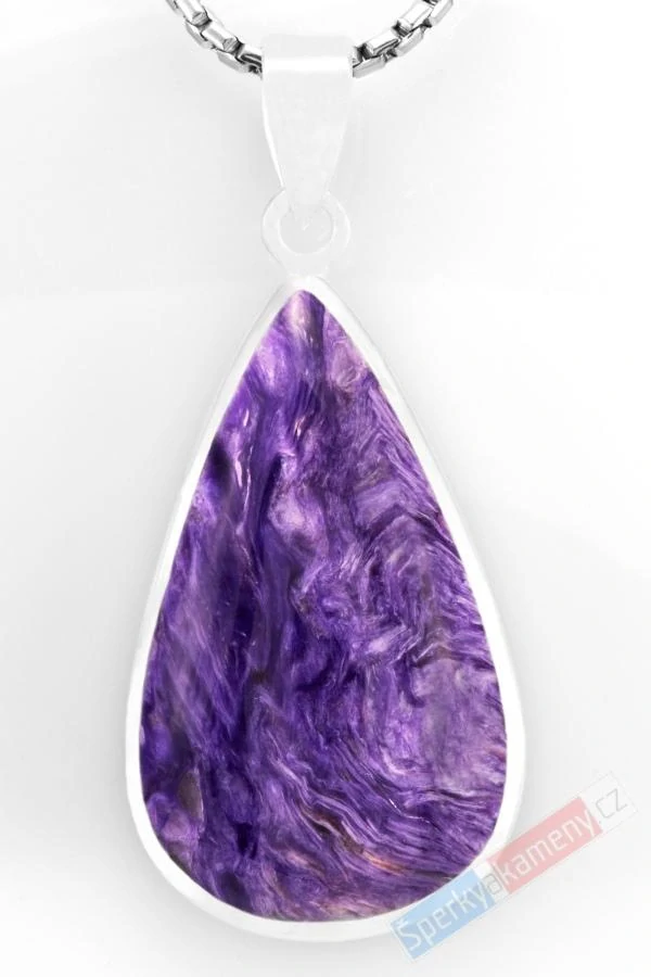 Přívěsek z čaroitu extra kvality QAA. Nádherné probarvení a vysoký lesk. Přívěsek má tvar kapky o výšce cca 36 mm (s úchytem cca 48 mm) a šířce cca 22 mm; váha 11,2 g. Zasazení, úchyt a závěs jsou ze stříbra (Ag 925/1000). Země původu: Rusko, Jakutsko. Řetízek není součástí šperku. Přívěsek je identický s fotografií.