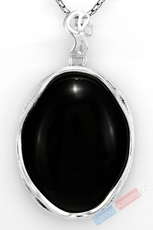 Větší přívěsek z černého onyxu extra kvality QAA. Přívěsek má tvar oválu o výšce cca 44 mm (se závěsem cca 59 mm), šířce cca 34 mm a tloušťce/hloubce cca 8 mm. Váha přívěsku je 21,5 g. Originální zasazení, úchyt a závěs jsou ze stříbra (Ag 925/1000). Původ minerálu Brazílie. Řetízek není součástí šperku. Přívěsek je identický s fotografií.