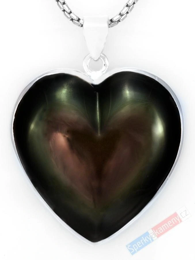 Přívěsek z duhového obsidiánu extra kvality QAA ve tvaru srdce. Pokud na přívěsek dopadne světlo v určitém úhlu, uvidíte v tomto přívěsku tvar menšího srdce jiných barev. Výška přívěsku cca 37 mm (se závěsem cca 47 mm), šířka cca 36 mm a tloušťka/hloubka cca 9 mm; váha 18,1 g. Zasazení, úchyt a závěs jsou ze stříbra (Ag 925/1000). Duhový obsidián je zvláštní sopečné sklo, které je černé ale zároveň i částečně průhledné a usazovalo se v tenkých vrstvách. Každá z vrstev odráží sluneční světlo v jiném barevném odstínu, a díky tomu má na slunci či při osvětlení proužky či obrazce v různých barvách. Původ minerálu: Mexiko. Řetízek není součástí šperku. Přívěšek je identický s fotografií (nasvíceno).